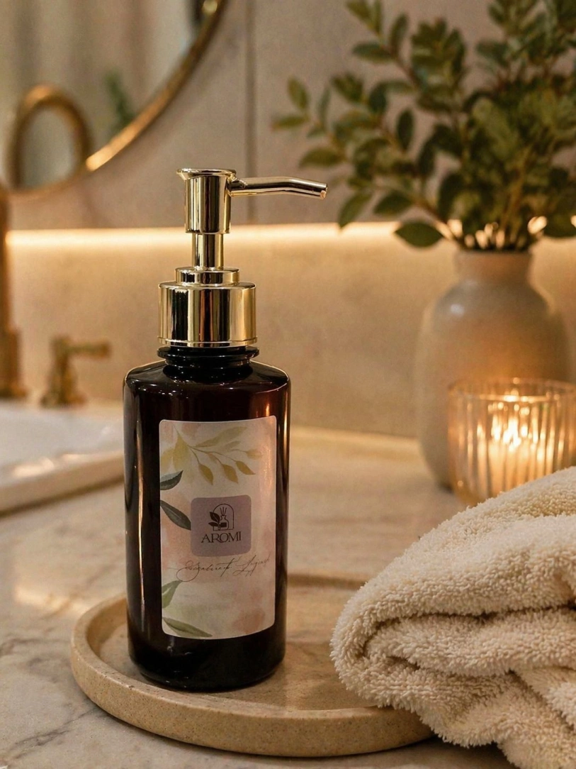 Saboneteira âmbar com sabonete líquido hidratante de lavanda de 250ml. Une elegância e cuidado, proporcionando uma limpeza suave com fragrância relaxante e agradável.